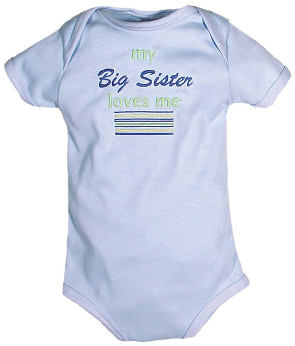 This is the perfect gift for a new baby boy who has a new Big Sister! Especially, if the new Big Sister may not be totally in love with her new baby brother, just yet! Raindrops 100% cotton interlock body suit is a nice hefty weight interlock, not jersey, which means it will keep your baby warm and comfortable, since it is heavier and softer than most others. It is finished with 2-needle cover stitching, which will provide longer wear and will hold up better throughout each wash. We have embroidered it with a clean, contemporary design and ‰ÛÒmy Big Sister loves me‰ on the front. This body suit can be worn on its own or paired with a short or a pant. There is a ‰ÛÒBrother‰ style available and a matching bib. Raindrops has been manufacturing top quality, unique baby garments in the USA, since 1936.