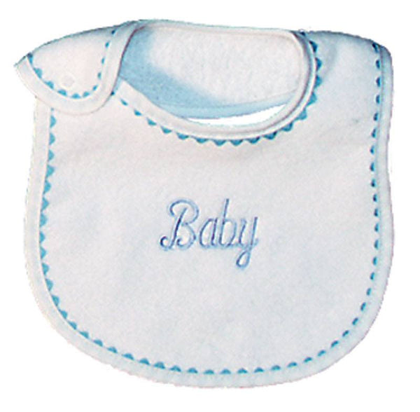 Classic and clean is how Raindrops describes this top quality bib. Embroidered with a simple, ÌÕBabyÌÒ, this bib is made from the best 100% cotton velour terry and will absorb all the messes your little one can create. There is no polyester in any of our velour terry, only cotton, and because of this, this top quality bib will absorb all liquids and continue to wear and wash beautifully. Pair it with the matching burp cloth and you have a beautiful, classic gift that stands on its own or can be added to any outfit to complete the gift. The blue embroidery and blue ric rac trim make it a boys bib, but it is available in pink and yellow, too! Raindrops has been manufacturing top quality, unique baby garments in the USA, since 1936.