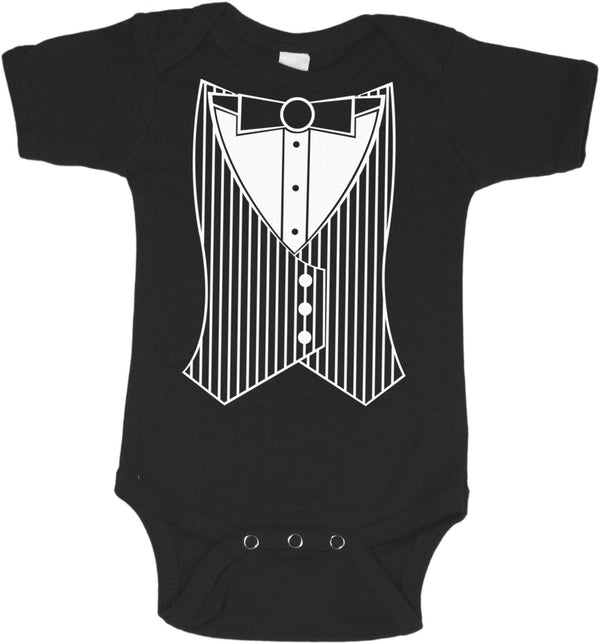 Shop baby Onesie Short Sleeve - Black Tuxedo at BibsNBeyond.com. We are one stop store for all baby clothing needs. A black infant baby tuxedo-vest onesie for making your little man look classy..