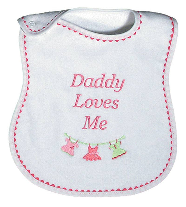 Raindrops, Daddy Loves Me is such a classic saying, but so filled with love and tenderness, every baby should have one! It is made in the best 100% cotton velour terry and it will absorb all the messes your little one can create. There is no polyester in any of our velour terry, only cotton, and because of this, this top quality bib will absorb all liquids and continue to wear and wash beautifully. It can be added to almost any baby girl outfit or baby gift, to convey the love that is given with baby gifts. The strawberry ric rac trim makes it a girl bib but there is a royal version, too. Check out the Mommy style for girls, also. Raindrops has been manufacturing top quality, unique baby garments in the USA, since 1936.