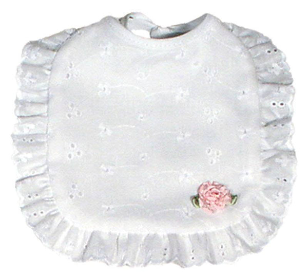 This is the most precious, traditional white eyelet bib ever created for your precious newborn baby girl! This sweet eyelet bib features an all over eyelet fabric, a small pink...