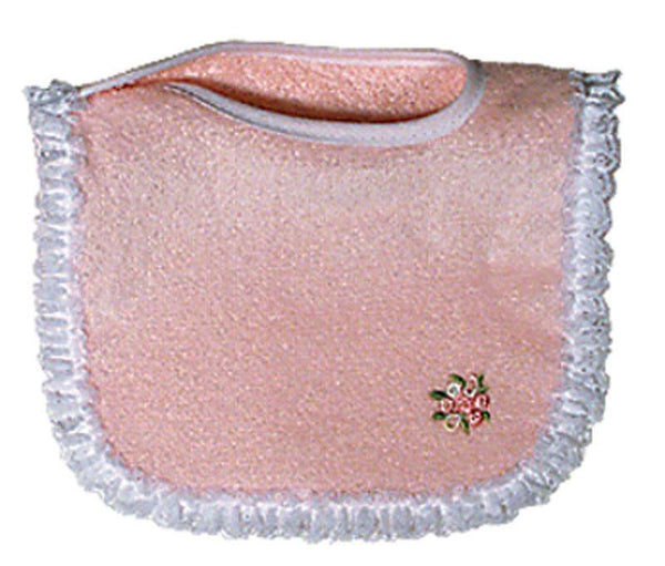 This is Raindrops classic, basic little newborn girl lace bib with a flower applique in the corner. You can not have too many of them! It is made from the best 100% cotton velour terry and will absorb all the messes your little one can create. There is no polyester in any of our velour terry, only cotton, and because of this, this top quality bib will absorb all liquids and continue to wear and wash beautifully. This bib can be added to almost any baby outfit or baby gift, giving it that little something extra at a great price! The pink velour terry and lace trim make it a girls bib. Raindrops has been manufacturing top quality, unique baby garments in the USA, since 1936.