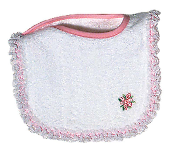 This is Raindrops classic, basic little newborn girl lace bib with a flower applique in the corner. You can not have too many of them! It is made from the best 100% cotton velour terry and will absorb all the messes your little one can create. There is no polyester in any of our velour terry, only cotton, and because of this, this top quality bib will absorb all liquids and continue to wear and wash beautifully. This bib can be added to almost any baby outfit or baby gift, giving it that little something extra at a great price! The pink and lace trim make it a girls bib. Raindrops has been manufacturing top quality, unique baby garments in the USA, since 1936.