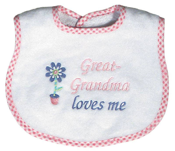 This is a great bib; pun intended! Raindrops ‰ÛÒGreat-Grandma loves me‰ embroidered bib honors a baby girl̻s Great-Grandma; after all she is not only a Grandma, she is great! The timeless style is made in the best 100% cotton velour terry and it will absorb all the messes your little one can create. There is no polyester in any of our velour terry, only cotton, and because of this, this top quality bib will absorb all liquids and continue to wear and wash beautifully. This bib can be added to almost any baby outfit or baby gift and let it communicate the love! The pink gingham makes it a girl bib, but it comes in blue, too! Raindrops has been manufacturing top quality, unique baby garments in the USA, since 1936.