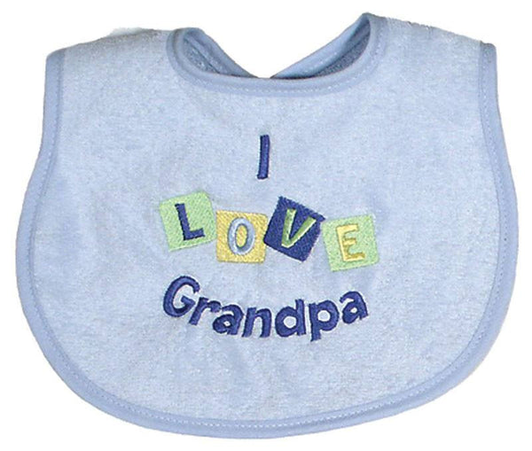 ‰ÛÒI LOVE Grandpa‰ is the best saying ever! He is a most important person and this Raindrops embroidered bib really shows the love between Grandpa and that sweet baby boy! It is made in the best 100% cotton velour terry and it will absorb all the messes your little one can create. There is no polyester in any of our velour terry, only cotton, and because of this, this top quality bib will absorb all liquids and continue to wear and wash beautifully. This bib can be added to almost any baby outfit or baby gift and it will just melt that soft spot in everyone̻s heart! The blue trim and fabric makes it a boy bib, but it comes in pink, too, and both colors come in a Grandma version! Raindrops has been manufacturing top quality, unique baby garments in the USA, since 1936.