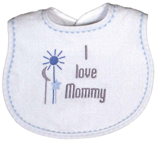 Raindrops modern embroidered, ÌÕI love MommyÌÒ cotton bib is a classic style that every baby boy should poses! This is one of our best selling Mommy bibs. This bib is made in the best 100% cotton velour terry and it will absorb all the messes your little one can create. There is no polyester in any of our velour terry, only cotton, and because of this, this top quality bib will absorb all liquids and continue to wear and wash beautifully. It can be added to almost any baby boy outfit or baby gift, to convey the love between a precious baby and his Mommy. The blue ric rac trim make it a boy bib but there is a pink version, too. It is also available in a Daddy version! Raindrops has been manufacturing top quality, unique baby garments in the USA, since 1936.