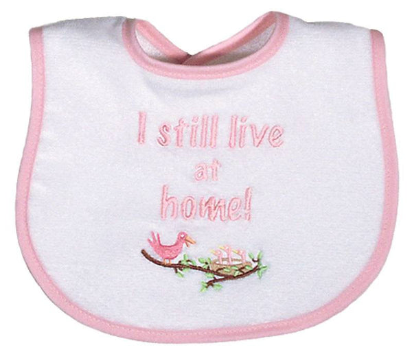 This Raindrops embroidered bib, ÌÕI still live at homeÌÒ are for all those little birds that have not flown out of the nest, yet! We love it! When that day comes, it will be too soon, right? It is made in the best 100% cotton velour terry and it will absorb all the messes your little one can create. There is no polyester in any of our velour terry, only cotton, and because of this, this top quality bib will absorb all liquids and continue to wear and wash beautifully. This bib can be added to almost any baby outfit or baby gift and bring in that little touch of humor! The pink trim makes it a girl bib, but it comes in blue, too! Raindrops has been manufacturing top quality, unique baby garments in the USA, since 1936.