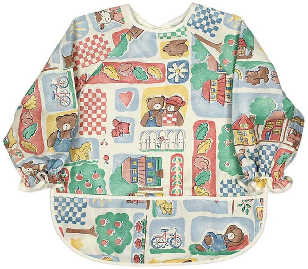 This is the long sleeve Raindrops bib that you need when a baby is starting to feed themselves and the food can go everywhere! It is made in the best 100% cotton Bears printed broadcloth and backed with water repellant nylon on the body only. The sleeves are cotton only, so no one gets over heated. A pocket is at the bottom to catch the crumbs! It can be added to almost any baby outfit or baby gift and used all year round. The bear print makes it a unisex bib, but there are other prints available, too. Raindrops has been manufacturing top quality, unique baby garments in the USA, since 1936.