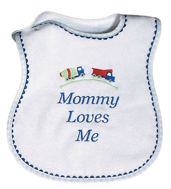 Raindrops, Mommy Loves Me is such a classic saying, but so filled with love and tenderness, every baby should have one! It is made in the best 100% cotton velour terry and it will absorb all the messes your little one can create. There is no polyester in any of our velour terry, only cotton, and because of this, this top quality bib will absorb all liquids and continue to wear and wash beautifully. It can be added to almost any baby boy outfit or baby gift, to convey the love that is given with baby gifts. The royal ric rac trim makes it a boy bib but there is a strawberry version, too. Check out the Daddy style for boys, also. Raindrops has been manufacturing top quality, unique baby garments in the USA, since 1936.