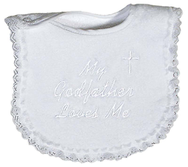One of our great selling Christening bibs, ÌÕmy Godfather loves me!ÌÒ whites embroidered bib with lace shows the love that only a Godfather can give! This top quality bib is made from the best 100% cotton velour terry and will absorb all the messes your little one can deliver. There is no polyester in any of our velour terry, only cotton, and because of this, this bib will absorb all liquids and continue to wear and wash beautifully. Match it with a multitude of newborn outfits or use it for a Christening! The lace trim makes it a girls bib and we offer it for Godmothers, too. Raindrops has been manufacturing top quality, unique baby garments in the USA, since 1936.