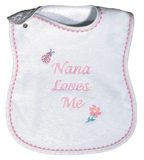 Not all Grandmas are a Grandma, some are a Nana! Raindrops offers this great selling, embroidered, ‰ÛÒNana Loves Me‰ bib to all baby girls and their Nana̻s everywhere! This bib is made in the best 100% cotton velour terry and it will absorb all the messes your little one can create. There is no polyester in any of our velour terry, only cotton, and because of this, this top quality bib will absorb all liquids and continue to wear and wash beautifully. The pink ric rac trim makes it a girl bib but there is a blue version, too. Raindrops has been manufacturing top quality, unique baby garments in the USA, since 1936.