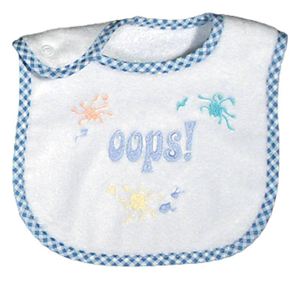 This is what bibs are for: all those little messes and spills that go along with babies and what do we say when they happen, oops! So, Raindrops has embroidered this bib with the, oops and the spills built right in! It is made from the best 100% cotton velour terry and will absorb all the messes your little one can create. There is no polyester in any of our velour terry, only cotton, and because of this, this top quality bib will absorb all liquids and continue to wear and wash beautifully. Pair it with the matching burp cloth and you have a beautiful, classic gift that stands on its own or can be added to any outfit to complete the gift. The blue embroidery and blue gingham trim make it a boys bib, but it is available in pink and yellow, too! Raindrops has been manufacturing top quality, unique baby garments in the USA, since 1936.