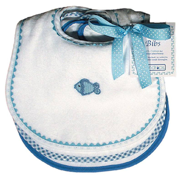 This is such a great Teething Bib Gift Set from Raindrops but it is also a very practical and usable gift! It includes three 100% cotton velour terry bibs backed with a water repellant backing, tied with a ribbon. The ric rac style on top has a crocheted fish, while the gingham trimmed bib and the royal binding bib are plain, since a baby may be wearing these for a few hours each day, we did not want to distract from any clothing. Our 100% cotton velour terry will absorb all the big messes and constant drooling from a teething baby. There is no polyester in any of our velour terry, only cotton, and because of this, these top quality bibs will absorb and continue to wear and wash beautifully. This is a boy set, but it is available in pink and yellow versions, too! Raindrops has been manufacturing top quality, unique baby garments in the USA, since 1936.