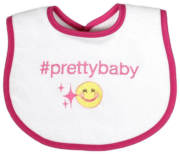 Hashtags are very cool and babies can be too! #Prettybaby is a fun, sweet way of describing all baby girls who are beautiful. All of a baby's basic needs and more are met in this, made in America, embroidered, 100% cotton velour terry bib. Why is this top quality bib so supper absorbent and soft next to baby's delicate skin? Because there is no polyester in our fabric. It will continue to wear and wash beautifully and coordinate with a multitude of baby clothes. This hot pink bib is for a girl, and there are eleven other styles available, as well: #sweetbaby, #divababy, and #chicbaby for girls, #cutebaby and #coolbaby for boys, and #sillybaby, #happybaby, #smellybaby, #loudbaby, #hungrybaby and #lovedbaby, which are all unisex. Raindrops has been manufacturing top quality, unique baby garments and gifts in the USA, since 1936.