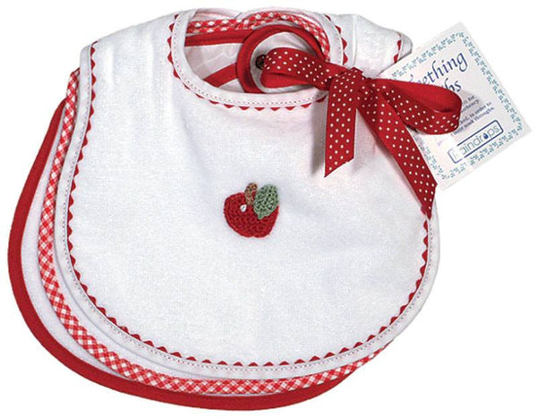 This Teething Bib Gift Set from Raindrops is a very practical and usable gift for any occasion! It includes three 100% cotton velour terry bibs backed with a water repellant backing, tied with a ribbon. The ric rac style on top has a crocheted apple, while the gingham trimmed bib and the red binding bib are plain, since a baby may be wearing these for a few hours each day, we did not want to distract from any clothing. Our 100% cotton velour terry will absorb all the big messes and constant drooling from a teething baby. There is no polyester in any of our velour terry, only cotton, and because of this, these top quality bibs will absorb and continue to wear and wash beautifully. This is a unisex set, but it is available in navy and yellow versions, too! Raindrops has been manufacturing top quality, unique baby garments in the USA, since 1936.