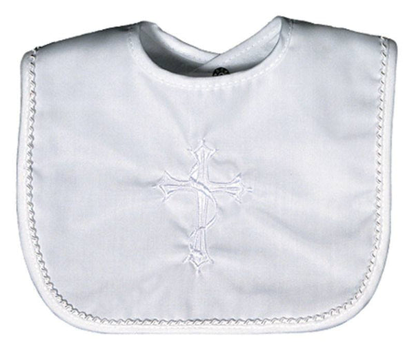 This is one of Raindrops best selling white cotton Christening bibs! It is embroidered with a beautiful, traditional cross and finished with a whip stitched trim. This bib is unisex and will work for both boys and girls. It is poly/cotton broadcloth fabric on front and backed with a 100% cotton flannel backing. It makes a wonderful keepsake and memory of the event, but it is a very usable bib! This will co-ornate with a wide variety of Christening outfits and gowns. There is a lace version, also, which is just for girls. Raindrops has been v top quality, unique baby garments in the USA, since 1936.