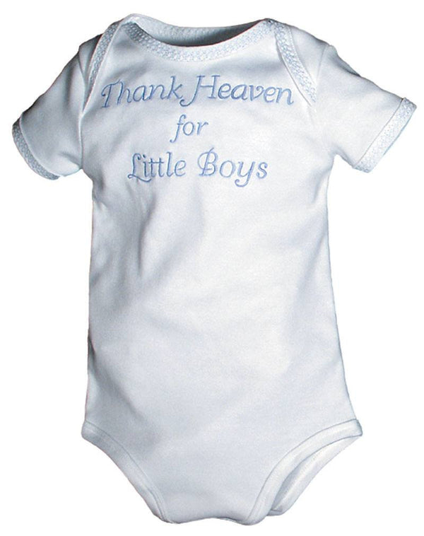 This ‰ÛÒThank Heaven for Little Boys‰۝ embroidered body suit is a timeless classic! What a great gift for such a precious little gift from God! Raindrops 100% cotton interlock body...