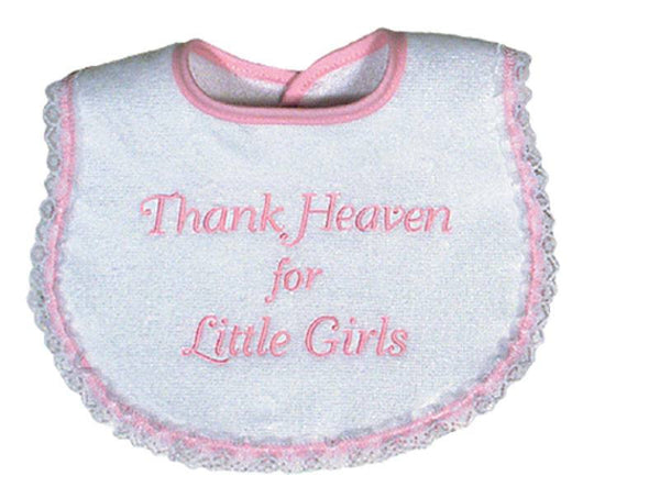 This is Raindrops classic and timeless embroidered bib, ‰ÛÒThank Heaven for Little Girls.‰ It is all about gratitude and love! This sweet bib matches a body suit, also. The traditional style is made in the best 100% cotton velour terry and it will absorb all the messes your little one can create. There is no polyester in any of our velour terry, only cotton, and because of this, this top quality bib will absorb all liquids and continue to wear and wash beautifully. This bib can be added to almost any baby outfit or baby gift and it will always communicate warm and fuzzy feelings. The pink trim and lace makes it a girl bib but it comes in blue and aqua, too! Raindrops has been manufacturing top quality, unique baby garments in the USA, since 1936.