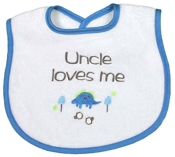 This is Raindrops best selling cotton, embroidered, ÌÕUncle loves meÌÒ bib. The bright colors accent a modern and yet, sweet style honoring a most important person, the Uncle! This bib is made in the best 100% cotton velour terry and it will absorb all the messes your little one can create. There is no polyester in any of our velour terry, only cotton, and because of this, this top quality bib will absorb all liquids and continue to wear and wash beautifully. It can be added to almost any baby boy outfit or baby gift, to convey the love between a precious baby and his Uncle. The royal binding makes it a boy bib but there is a strawberry version, too. It is also available in a Auntie style! Don̥t miss the matching body suit. Raindrops has been manufacturing top quality, unique baby garments in the USA, since 1936.