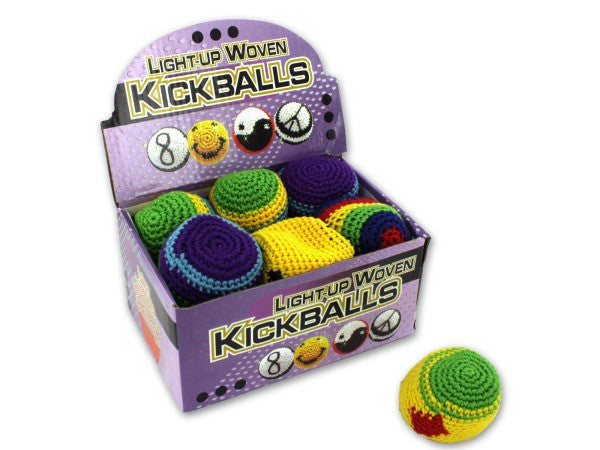 Perfect for outdoor fun, this Light-Up Woven Kick Sack features a colorful woven ball filled with a red/blue LED flashing light surrounded by plastic pellets. Flashing lasts approximately 15 seconds before shutting off. Patterns and styles may vary but may include checkers, stripes and yin yang designs. Ideal for children ages 3 and up. Countertop display comes with 12 pieces.