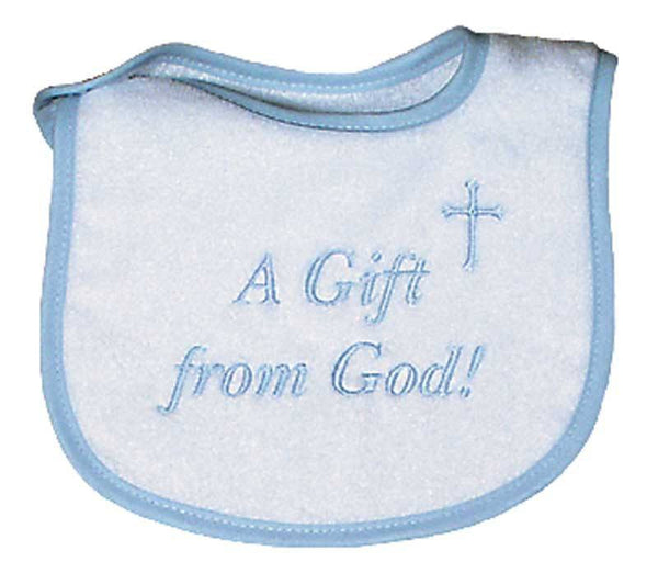Raindrops A Gift from God! blue embroidered bib conveys such a true saying! All babies are a real gift! This bib is made from the best 100% cotton velour terry and will absorb all the messes your little one can create. There is no polyester in any of our velour terry, only cotton, and because of this, this bib will absorb all liquids and continue to wear and wash beautifully. Co-ordinate it with a multitude of newborn boy outfits and let this bib convey that message of love to all who see it! The blue embroidery makes it a boy newborn bib but it comes in white and pink, too. Raindrops has been manufacturing top quality, unique baby garments in the USA, since 1936.