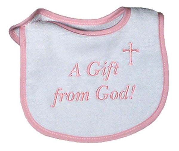 Raindrops A Gift from God! pink embroidered bib conveys such a true saying! All babies are a real gift! This bib is made from the best 100% cotton velour terry and will absorb all the messes your little one can create. There is no polyester in any of our velour terry, only cotton, and because of this, this bib will absorb all liquids and continue to wear and wash beautifully. Co-ordinate it with a multitude of newborn girl outfits and let this bib convey that message of love to all who see it! The pink embroidery makes it a girl newborn bib but it comes in white and blue, too. Raindrops has been manufacturing top quality, unique baby garments in the USA, since 1936.