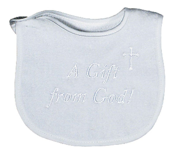 Raindrops A Gift from God! white embroidered bib conveys such a true saying! All babies are a real gift! This bib is made from the best 100% cotton velour terry and will absorb all the messes your little one can create. There is no polyester in any of our velour terry, only cotton, and because of this, this bib will absorb all liquids and continue to wear and wash beautifully. Co-ordinate it with a multitude of newborn outfits and let this bib convey that message of love to all who see it! The white embroidery makes it a unisex newborn bib, so it is good for both boys and girls but it comes in pink and blue, too. Raindrops has been manufacturing top quality, unique baby garments in the USA, since 1936.