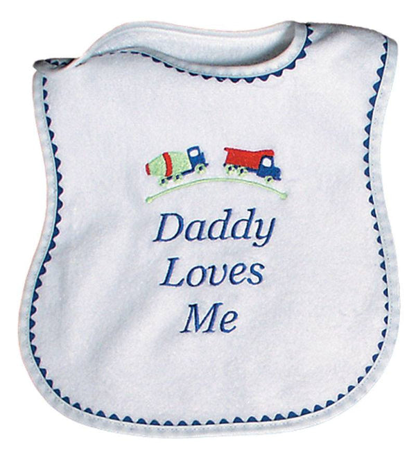 Raindrops, Daddy Loves Me is such a classic saying, but so filled with love and tenderness, every baby should have one! It is made in the best 100% cotton velour terry and it will absorb all the messes your little one can create. There is no polyester in any of our velour terry, only cotton, and because of this, this top quality bib will absorb all liquids and continue to wear and wash beautifully. It can be added to almost any baby boy outfit or baby gift, to convey the love that is given with baby gifts. The royal ric rac trim makes it a boy bib but there is a strawberry version, too. Check out the Mommy style for boys, also. Raindrops has been manufacturing top quality, unique baby garments in the USA, since 1936.