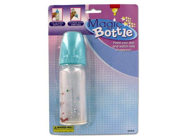 Perfect for pretend play, this Magic Baby Bottle empties when tilted down and refills when tilted up. Comes with either orange or white liquid that looks like orange juice or milk. Measures approximately 6" tall. Not recommended for children under 3. Comes packaged in a blister pack.
