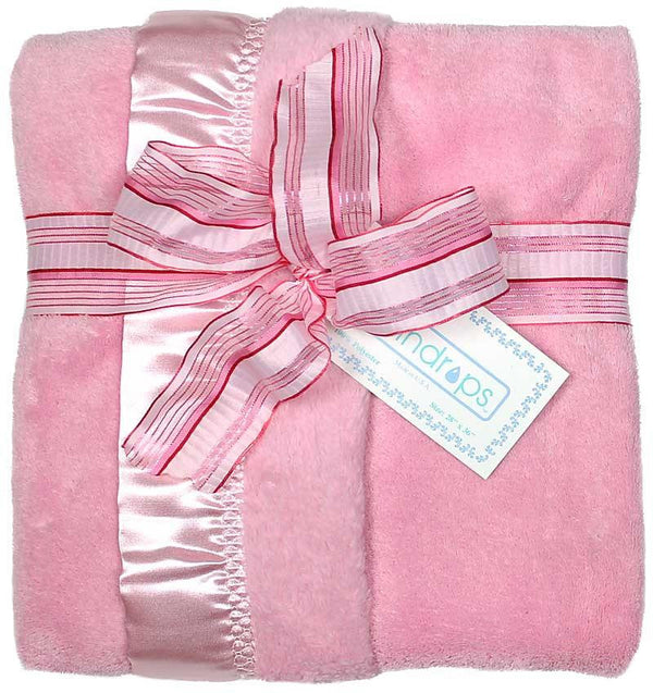 This is Raindrops ultimate super soft, Flurr Receiving Blanket! You've got to feel it to believe it! This pink blanket features a 2 inch satin binding all around the edges that is attached with a custom embroidered trim. It measures a generous 28 inches by 36 inches. Our top quality flurr is warm, soft to the touch and machine washes and drys beautifully! This luxurious blanket will be treasured by every baby who receives it! It makes a beautiful baby gift on its own or can be added to almost any other items, for an amazing presentation! It can be used not only to cover baby up but can also be used in a bed or car seat or even on the floor for baby to lay on! Check out the included gift packaging with matching wired ribbon! This pink blanket is for a girl, but it also comes in white, blue and sage green. Raindrops has been manufacturing top quality, unique baby garments in the USA, since 1936.