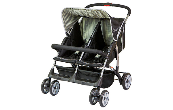 Dream On Me 474, Side by Side Double Stroller has everything a busy parent needs to keep their children safe and on the move. A padded 5-point harness, one touch rear brake, removable bar, and swivel front locking wheels provides a safe and smooth ride for both children. Individual 5-position seat recline allows each child to have a different seat position. One large canopy with peek-a-boo windows allows parents to keep a watchful eye on their children and the two storage baskets are great for storing all your necessities. This stroller is great for traveling or a day out shopping with the kids. Padded 5-point harness, one touch rear brake, removable bar, swivel front locking wheels, Individual 5-position seat recline, 2 large canopies with peek-a-boo, two storage baskets.