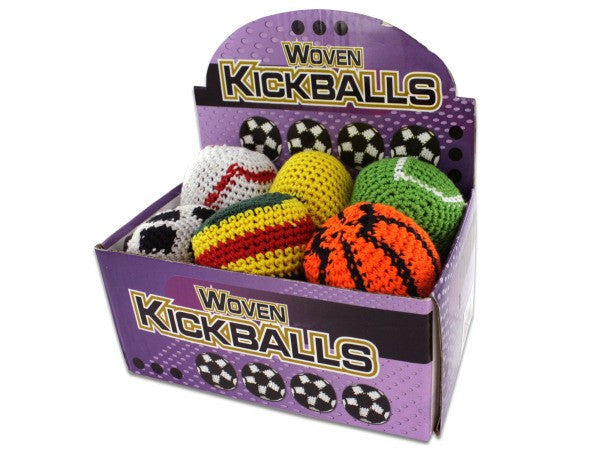 Great for outdoor play, these Sports Theme Kick Sacks guarantee to provide hours of fun! Display comes with the following styles: basketball, baseball, soccer ball, tennis ball, volleyball and more. Balls are made of woven string and are filled with beads. Each ball comes with a UPC label on the bottom. Not for children under 3. Display measures 8" x 3 3/4" x 6 1/4" and each kick sack is approximately 2" in diameter. Countertop display comes with 24 pieces.