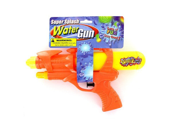 Stay cool while having lots of fun with this colorful Super Splash Water Gun featuring a large removable water storage tube and a unique futuristic design. Measures approximately 10 inches long and 5.5 inches high. Comes in assorted colors. Comes packaged with a wrap around tag.